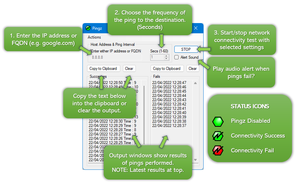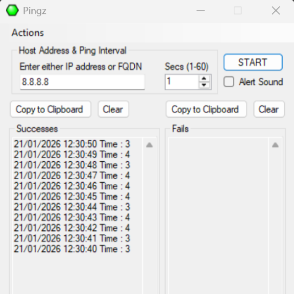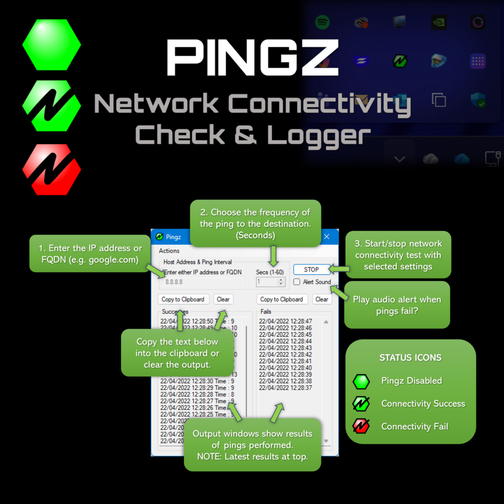 Choose what to ping and frequency and click start. This logs success and failures, minimises to the system tray with status icons to keep the user informed.